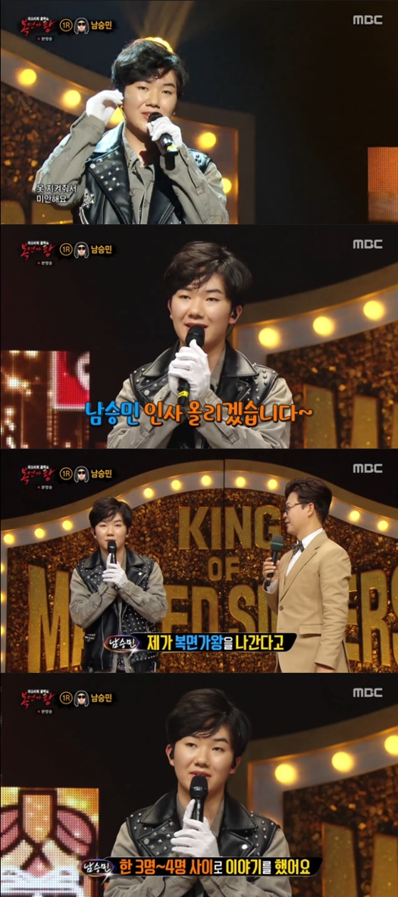 남승민은 "평소 같으면 안 떨렸을텐데 스물 한 분의 선배님이 계셔서 되게 떨렸다"라고 소감을 밝혔다. 판정단의 요청에 나훈아의 곡 '무시로'를 불러 박수를 받았다. 남승민의 목표는 2, 3라운드 진출, 가왕이 아니라 러블리즈와 이달의 소녀 사인을 받아가는 거였다. 남승민은 "대선배님들의 사인을 모두 다 받고 싶지만 제가 '복면가왕'에 나간다고 한 세명에서 네명에게 이야기를 했다. 선배님의 사인을 안 받아오면 마산에 내려올 생각하지 말라고 하더라"라고 말해 웃음을 자아냈다.