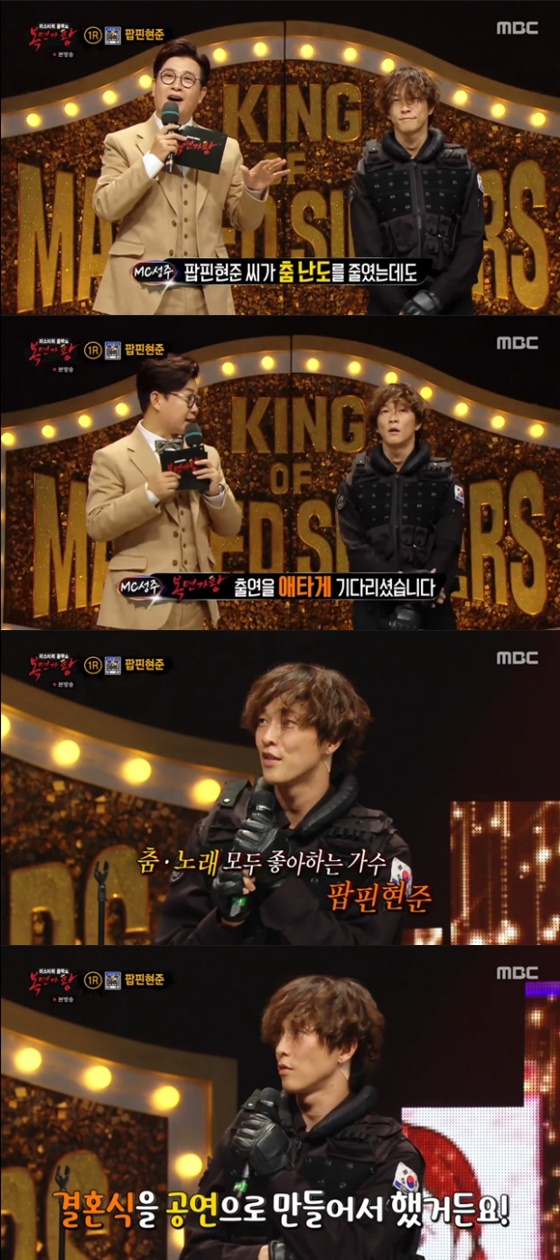 복면을 벗은 '지뢰찾기'는 팝핀현준이었다. 팝핀현준은 "춤이 아니라 노래를 불러 보고 싶었다. 춤도 추지만 노래도 좋아하는 가수라는 걸 보여드리고 싶었다"라며 '복면가왕' 출연을 고대한 이유를 밝혔다. 이어 아내이자 국악인 박애리에 대해 언급했다. 팝핀현준은 "저희가 결혼식을 공연으로 만들어서 했다. 결혼식을 보시고 축하한다는는 말과 동시에 공연 전체를 얼마에 섭외할 수 있냐고 하시더라. 또 저희 부부가 이슈가 되서 퍼포먼스를 많이 선보이게 됐는데 둘이 만나면 행사 많이 할 수 있어서 이걸 알고 전략적인 결혼 아니냐고 하더라. 그냥 사랑해서 결혼한거다"라고 강조했다.
