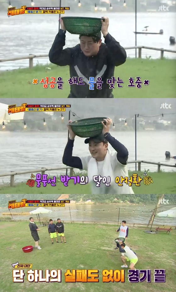 이날 배태랑들은 수상 레포츠를 즐긴 후 물풍선 던지기 게임에 나섰다. 한 명이 물풍선을 던지면 다른 사람이 머리 위에 바구니를 올린 채 받는 방식이다. 현주엽과 안정환, 김용만과 안정환, 김호중과 정호영이 한 팀이 돼 게임이 시작됐다.