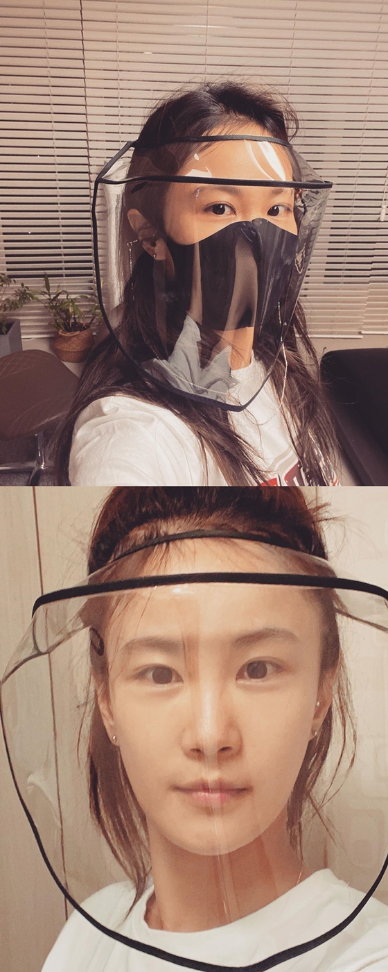 공개된 사진에는 김지민이 투명 안면 보호 마스크를 착용하고 있다. 여기에 마스크까지 쓰고, 코로나19 감염 예방에 나서 이목을 끌었다.