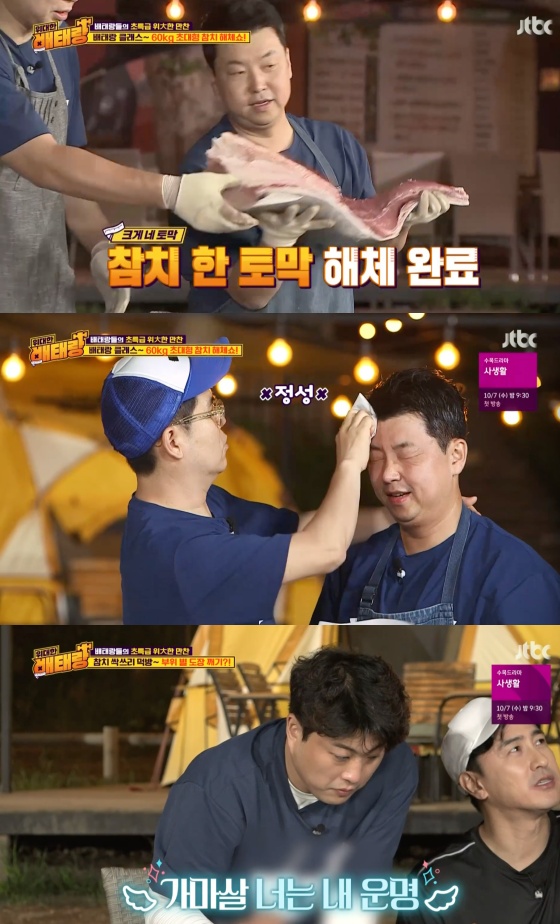 14일 오후 방송된 종합편성채널 JTBC 예능프로그램 '위대한 배태랑'에는 멤버들의 마지막 MT가 담기며 정호영의 참치 해체쇼가 펼쳐졌다.