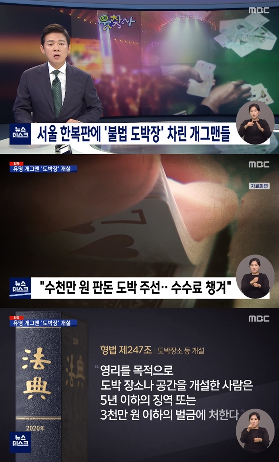 '뉴스데스크'에 따르면 재판에 넘겨진 개그맨 김씨는 SBS '웃찾사', tvN '코미디 빅리그' 같은 개그 프로에서 왕성한 활동을 했다. 김씨는 동료 개그맨 최씨와 도박장소 개설 등의 혐의로 지난 1일 재판에 넘겨졌다. 또한 경찰 조사결과 이들은 2018년 초 서울 강서구 한 오피스텔에서 불법 도박장을 개설, 도박을 주선하고 수수료를 챙겨왔다고.