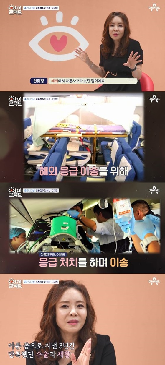 안희정은 "다 부러져 있었기 때문에 비행기 좌석을 다 떼고 침대를 설치해서 침대 위에 묶여서 와야 했다"며 "진통제를 맞고 수혈을 하면서 그렇게 한국을 왔다"고 전했다. 이어 그는 "죽을까봐도 무서웠지만, 그 아픈 3년과 수술을 하고 재활을 하고 또 수술을 하면서 이겨내는 과정이 정말 힘들었다"고 토로했다.
