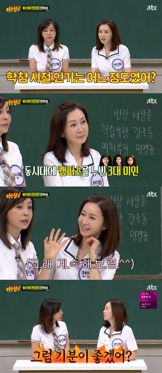 26일 방송된 JTBC 예능 프로그램 '아는 형님'에서는 황신혜와 전인화가 전학생으로 출연했다.