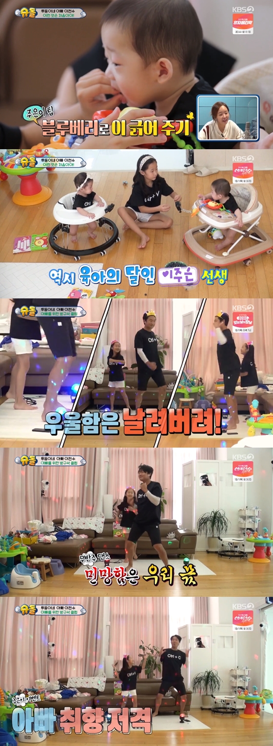 쌍둥이가 잠든 뒤에는 퇴사한 아빠를 위로하기 위한 이벤트가 이어졌다. "아빠 회사 짤린 거 때문에 준비한 거다"라던 주은이는 아빠와 함께 무선 이어폰을 꽂고 함께 노래를 재생해 고요 속의 댄스 타임을 가졌다.