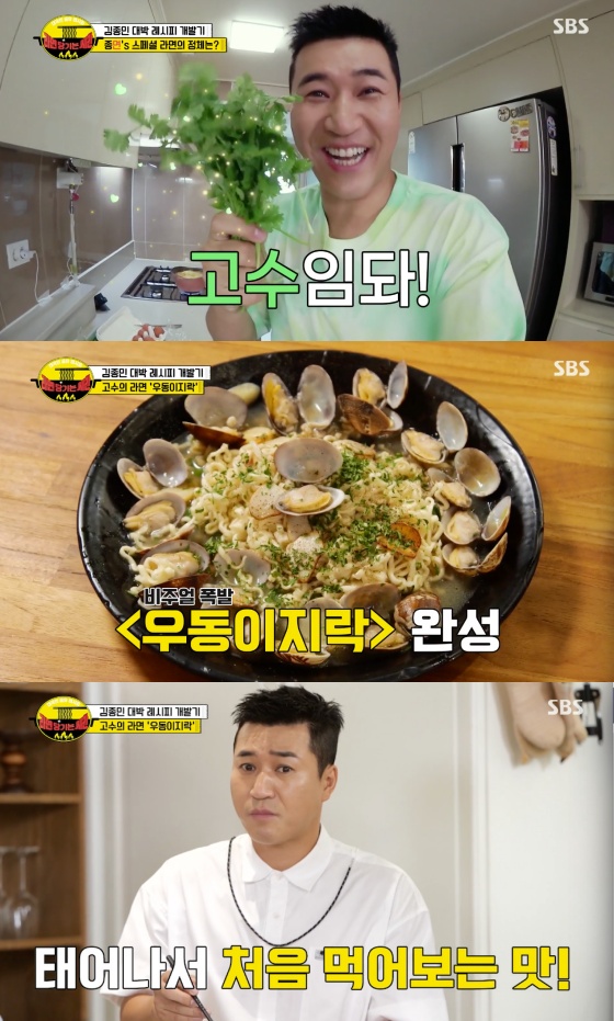 30일 오후 방송된 SBS 예능 프로그램 '대국민 공유 레시피, 라면 당기는 시간'에는 김종민이 라면 전문가들을 만나 새로운 메뉴를 개발하는 장면이 담겼다.
