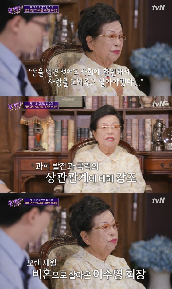 이수영 회장은 지난 30일 방송된 tvN 예능 프로그램 '유 퀴즈 온 더 블럭'에 출연해 평생 모은 766억원을 기부한 사연을 밝혔다.