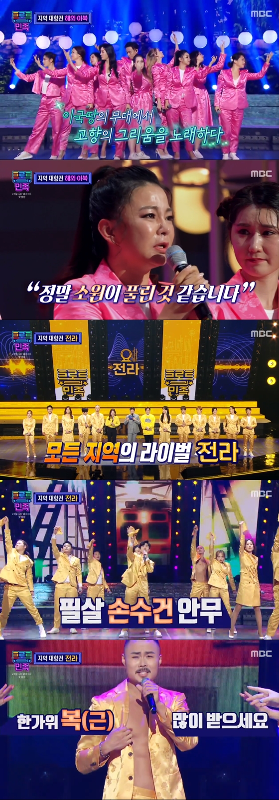 해외, 이북팀은 '한 많은 대동강'을 선곡해 완벽히 몰입한 표정으로 무대를 꾸몄다. 분단을 몸으로 표현한 안무와 한을 가득 풀어낸 무대는 모두에게 뭉클함을 안겼다. 권설경은 "창법도 단 하나로 부를 수 있었는데 여기에서 나를 위한 창법으로 부를 수 있다는 게 꿈을 이룬 것 같다. 받아주셔서 감사하다"며 소감을 전했다.