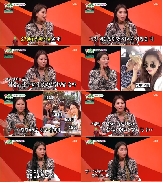 27살에 엄마가 된 오윤아는 '워킹맘'으로서 고충도 털어놓았다. "말을 할 시기가 됐는데 소통이 안 돼서 답답했다. 가장 힘들었던 건 아이가 아플 때 아프다는 표현을 못 했던 것이다. 그런 민이를 두고 촬영을 하러 갈 때 힘들었다"고 고백했다. 이어 "지금은 인지능력이 좋아졌고, 원하는 게 있으면 명확하게 요구한다"고 말했다.