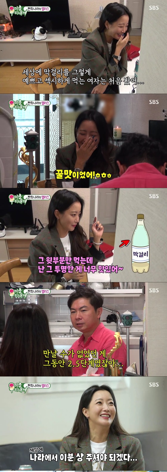이어 김희선은 "막걸리를 주문하면 주인 아주머니한테 핵운반보다 더 조심히 달라고 한다. 막걸리의 윗부분만 먹는데, 난 그 투명한 게 너무 맛있다"며 막걸리 취향을 언급했다.