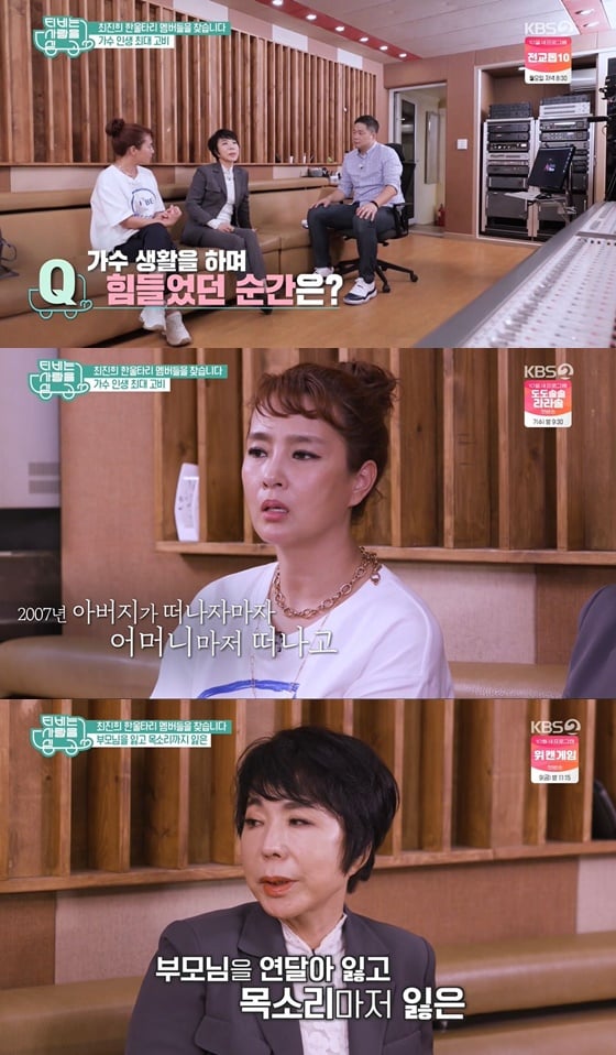 7일 오후 방송된 KBS 2TV 예능프로그램 'TV는 사랑을 싣고'에서 가수 최진희가 2007년, 부모님의 잇따른 별세에 힘들었다고 전했다.