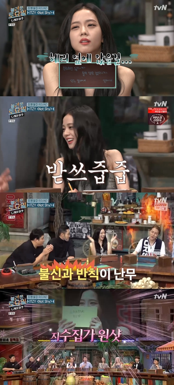 짬뽕물회가 걸린 1라운드는 있지(ITZY)의 '낫 샤이(Not Shy)'였다. 자리 선정부터 원샷 욕심을 뽐낸 지수는 노래가 끝나자마자 양 옆의 김동현, 넉살의 받아쓰기를 훔쳐봐 웃음을 자아냈다. 넉살은 정작 본인의 받쓰판은 다 가리는 지수에 "벌써 보면 어떡하냐. 안 볼 테니 그만 가려라"며 분노를 표하기도 했다.