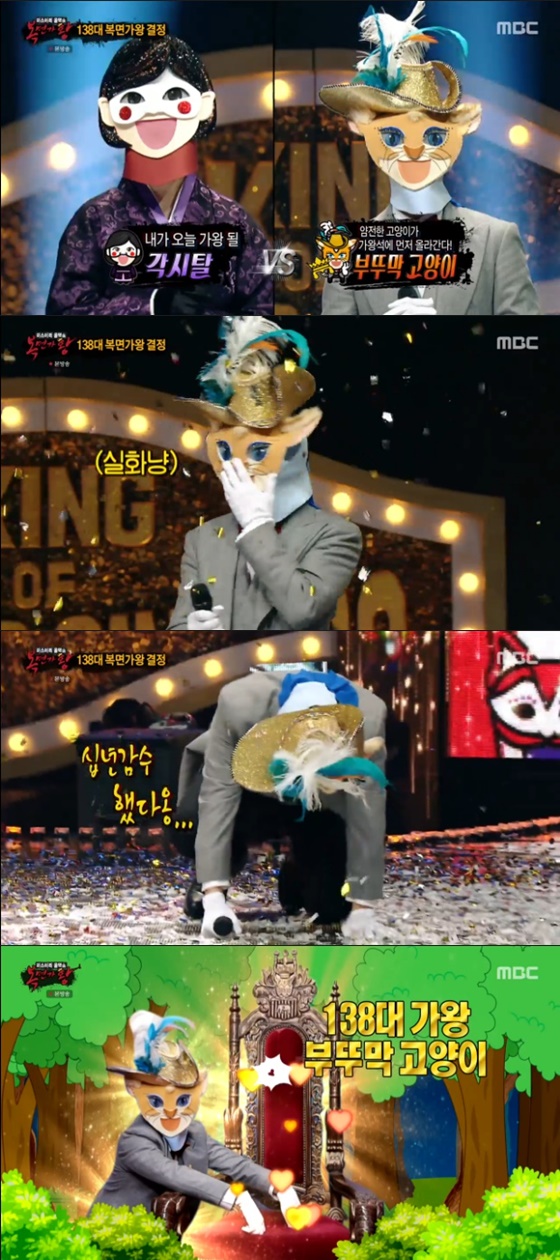 '복면가왕' 부뚜막 고양이가 첫 가왕 방어전에 성공했다. 그는 가왕전에 진출한 러블리즈 케이를 꺾고 2연승을 거뒀다.