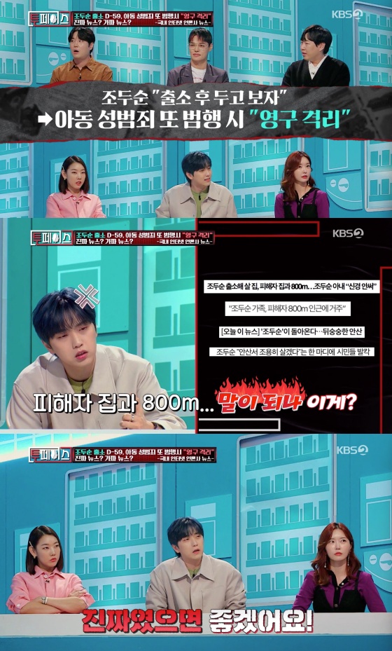 이날 뉴스 감별 주제는 '아동 성범죄 재범을 저지른 성범죄자에게 영구 종신형이 가능한가'였다. 이에 산들은 "사실이었으면 좋겠다"며 분노했다. 사실 여부를 떠나 개인적인 감정을 드러낸 것.