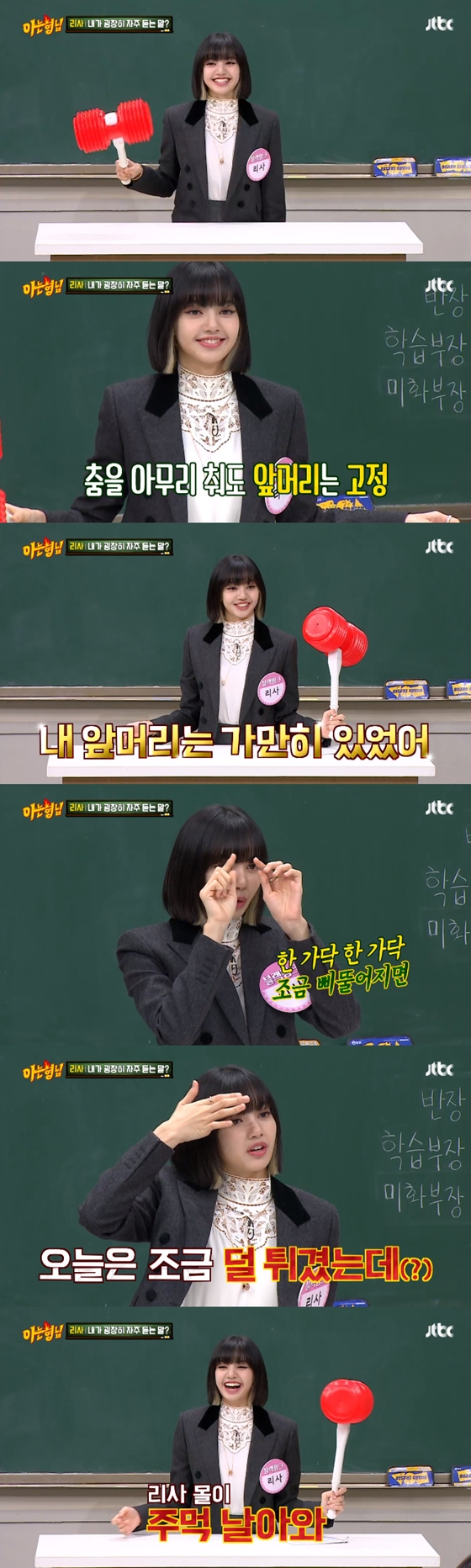 이를 두고 지수가 "앞머리 살짝 스치지? 주먹 날아와"라면서 리사가 유독 앞머리에 신경을 쓰고 있음을 털어놓았다.