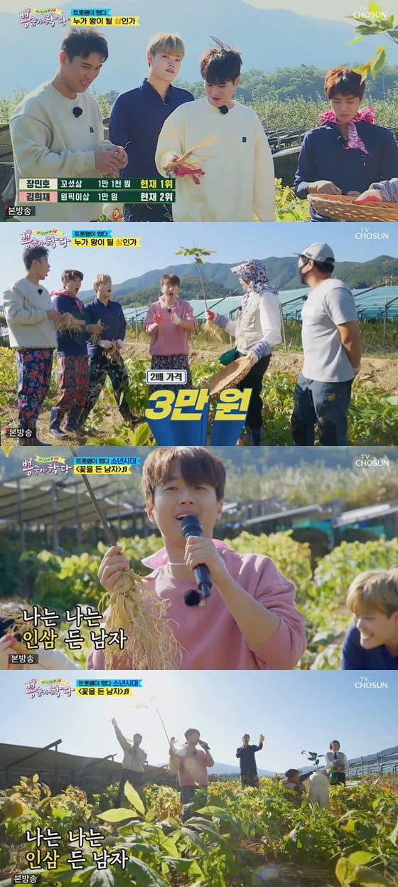 이에 김희재와 김경민, 황윤성, 이찬원, 장민호는 열심히 인삼을 캐기 시작했고 각자 캔 것 중 A급을 골라 '인삼 선발대회'를 열었다.