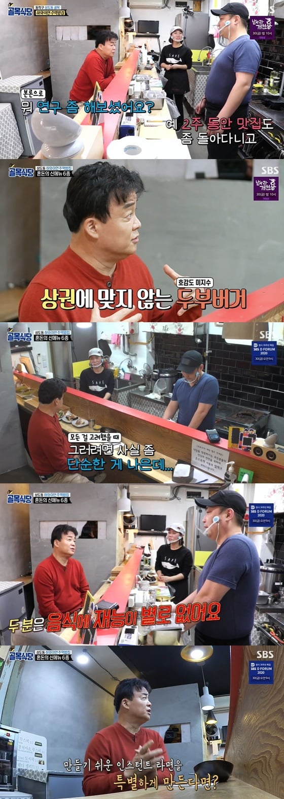이어 백종원은 "솔직히 말하면 두 분은 음식에 재능이 없다. 기술이 들어간 것 보다는 피곤하더라도 몸을 많이 움직이는 게 좋겠다"며 라면을 신메뉴로 추천했다.