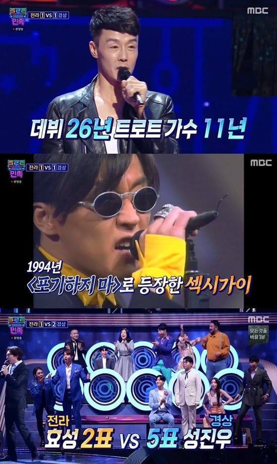 30일 오후 방송된 MBC 예능프로그램 '트로트의 민족'에서 1994년 '포기하지 마'로 데뷔한 가수 성진우가 경상 팀으로 모습을 드러냈다.