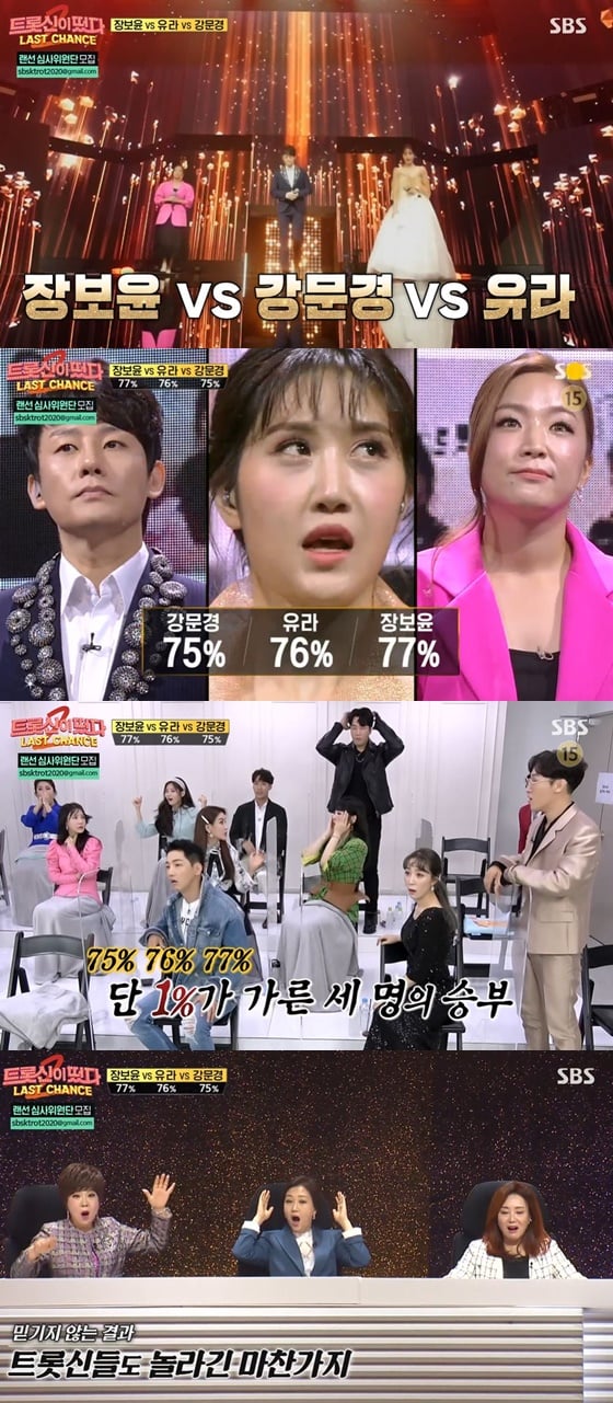 '트롯신이 떴다2 라스트 찬스'에서 장보윤, 유라, 강문경이 각 1% 차이로 승부가 결정났다.