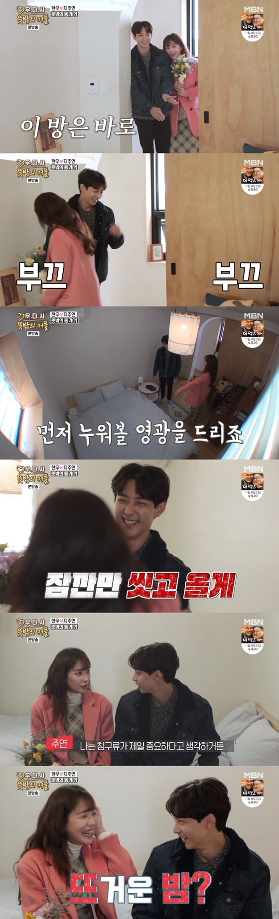 현우, 지주연은 보금자리에 들어 선 후 집 곳곳을 둘러봤다. 두 사람은 'D'자 문 앞에 서 어떤 방일지 궁금해 했다. 이어 방문을 연 두 사람은 침실을 확인한 후 함께 침대에 앉았다.