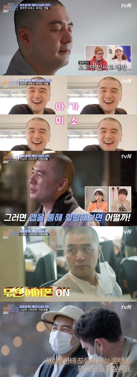 7일 방송된 tvN 예능프로그램 '온앤오프'에서는 혜민스님과 구준엽, 넉살이 출연해 일상을 공개했다.