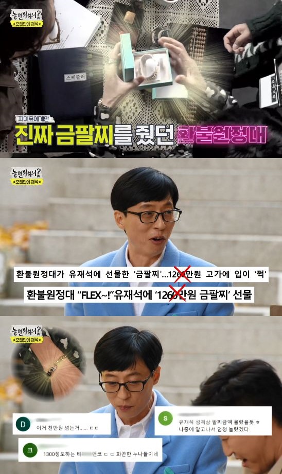 이날 방송에서 김종민은 대화 도중 유재석에게 "형만 금 받았지 않나"라며 금팔찌에 대한 질문을 던졌다. 앞서 유재석은 환불원정대 멤버들에게 민트색 선물 상자에 담긴 금팔찌를 선물 받은 바 있다.