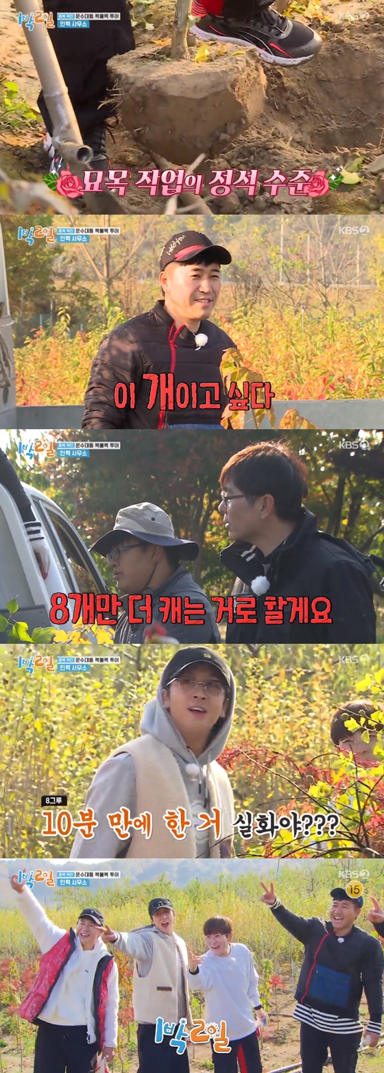 나머지 네 사람은 인력 사무소를 통해 묘목을 캐러 향했다. 딘딘은 뜻밖의 재능을 보이며 기술자처럼 묘목을 캤고, 이에 김종민은 파이프를 뽑고, 뽑힌 묘목을 끈으로 묶고, 묘목을 트럭으로 옮기는 등 잡일을 도맡아 하는 모습을 보였다.