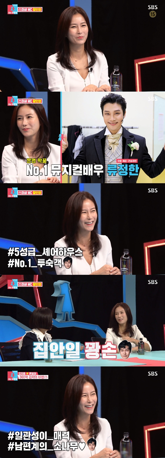 또 황인영은 류정한의 공연을 보기도 한다고. 그녀는 "제가 봐도 너무 멋있다"고 운을 뗀 후, "결혼하고 사는데, 너무 깜짝 놀랐다. 신생아인 줄 알았다. 계속 누워있고"라고 류정한의 반전 현실을 깜짝 폭로했다. 이 뿐만 아니라 요즘은 바뀌기는 했지만, 집안일은 안 한다고 밝히기도 했다. 이에 김구라가 류정한의 나이를 물었고, 황인영은 "50(한국나이)"이라고 했다. 김구라와 서장훈이 류정한의 나이를 알고, "체력 소모가 엄청나", "피곤할 때야"라며 옹호에 나서기도 했다.