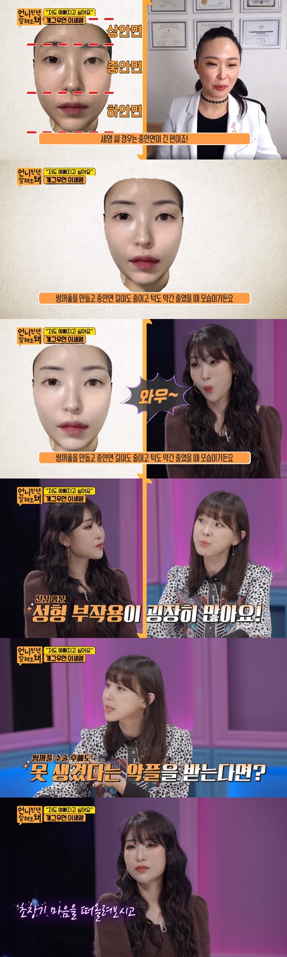 이지혜는 "성형 해본 경험자의 말이다. 나도 지방을 과하게 넣어서 부작용이 생겼었다. 다행히도 지금은 돌아왔다"라며 "성형 후 예측 모습은 개성이 없다. 너무 흔한 모습이다. 만약 쌍꺼풀 후에도 못생겼다는 악플을 받으면 어떻게 할 것이냐. 그러다 코도 하고 턱도 하고 그렇게 성형 중독이 된다"라고 전했다.