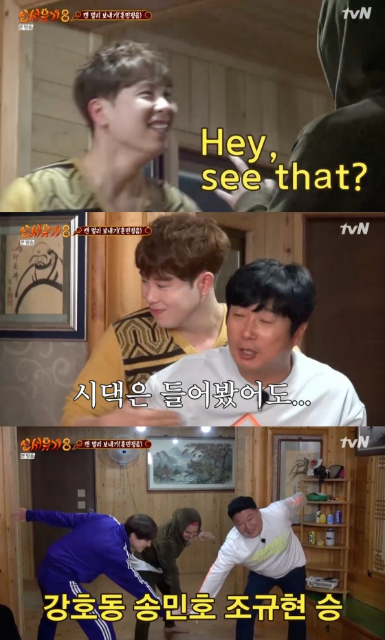 27일 오후 방송된 tvN 예능프로그램 '신서유기8-옛날 옛적에'에는 저녁식사를 걸고 홍팀(은지원, 이수근, 피오)과 청팀(송민호, 규현, 강호동)이 대결을 하는 장면이 담겼다.