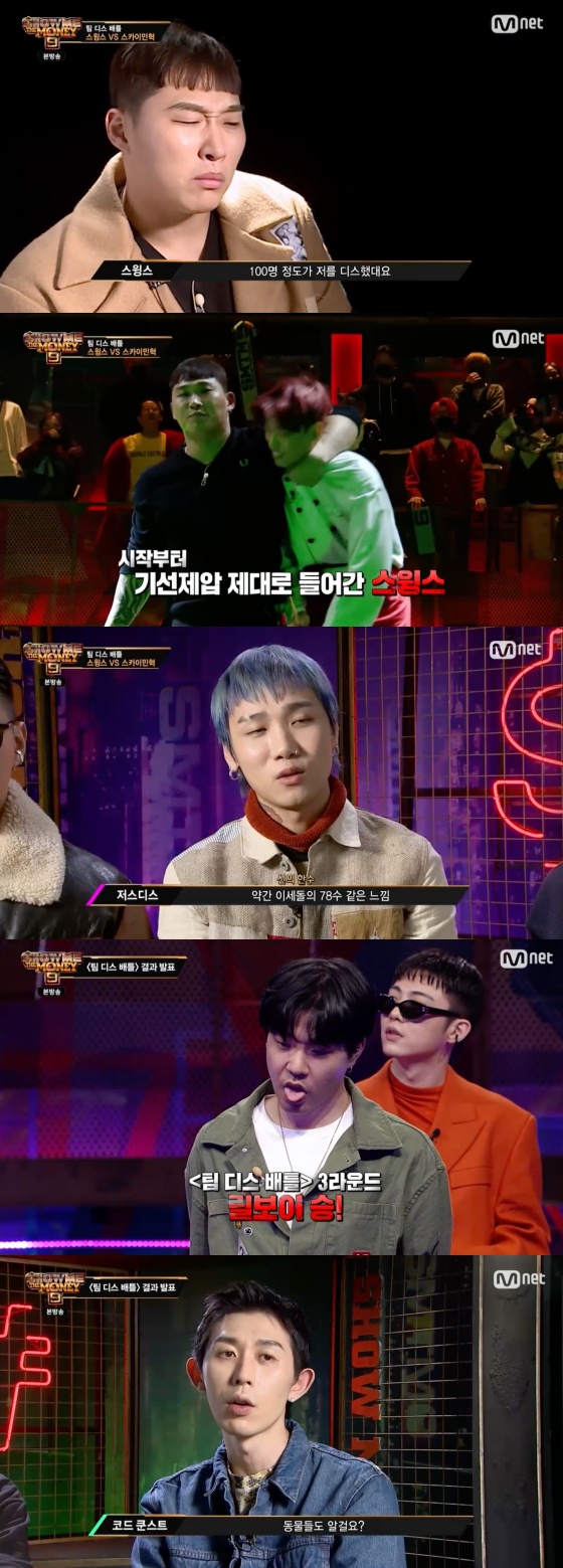 가수 스윙스가 '쇼미더머니9'에서 스카이민혁을 상대로 디스전을 벌여 반전 없이 승리했다.
