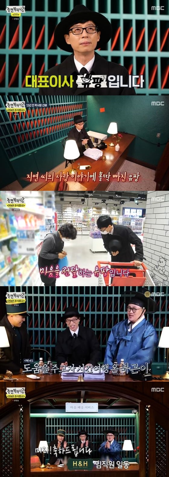 유재석은 "평소 하기 어려웠던 말을 대신 전해드린다. 하트&하트 주식회사"라고 'H&H 주식회사'의 시작을 알렸다. 이어 유재석은 아이돌을 좋아하는 자녀를 둔 부모의 사연, 13년 전 첫사랑을 찾는 사연 등 여러 사연에 유재석은 영상 통화를 하며 의뢰를 접수했다.