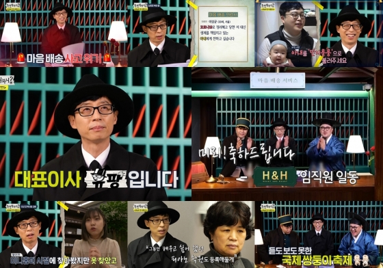 MBC '놀면 뭐하니?' 유재석이 마음을 배달해주는 H&H 주식회사의 대표 '유팡'으로 변신, 의뢰인들의 진심을 대신 전해주는 활약으로 안방에 깊은 감동과 울림을 선사했다. 여기에 신입 마음배달꾼 종벨(김종민)과 대북곤(데프콘)은 명불허전 예능감과 유팡과의 환상 케미로 웃음까지 책임졌다.