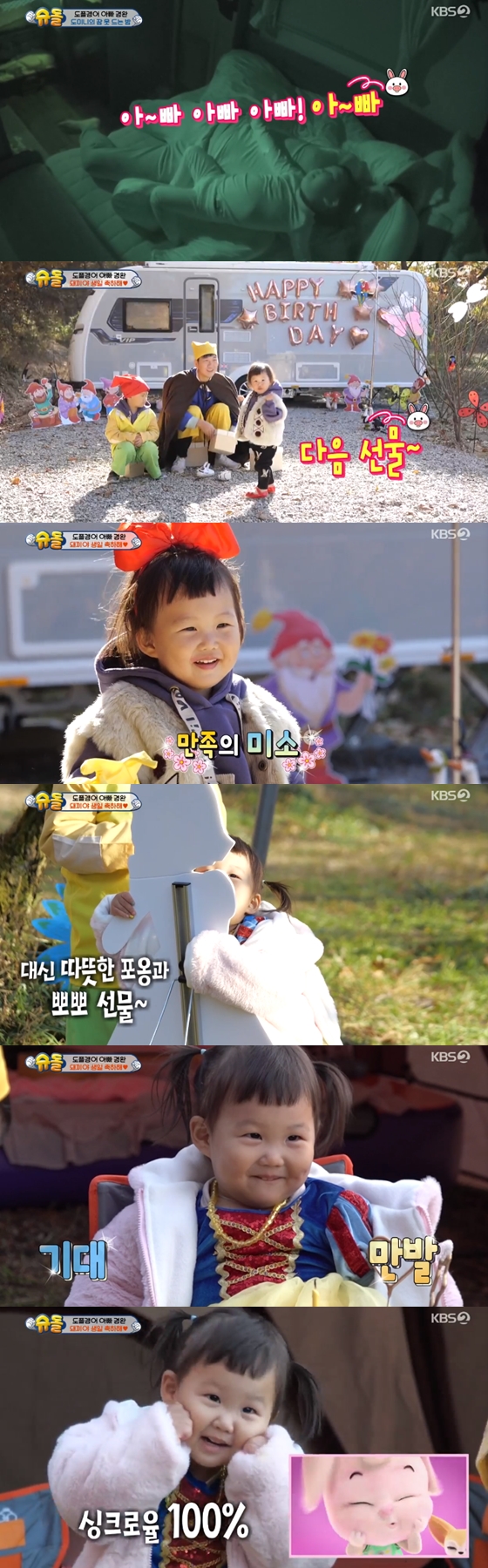 6일 오후 방송된 KBS 2TV 예능 프로그램 '슈퍼맨이 돌아왔다'에서는 두 번째 생일을 맞은 하영이가 캠핑장에서 아빠 도경완, 오빠 연우와 생일파티를 하는 모습이 그려졌다.