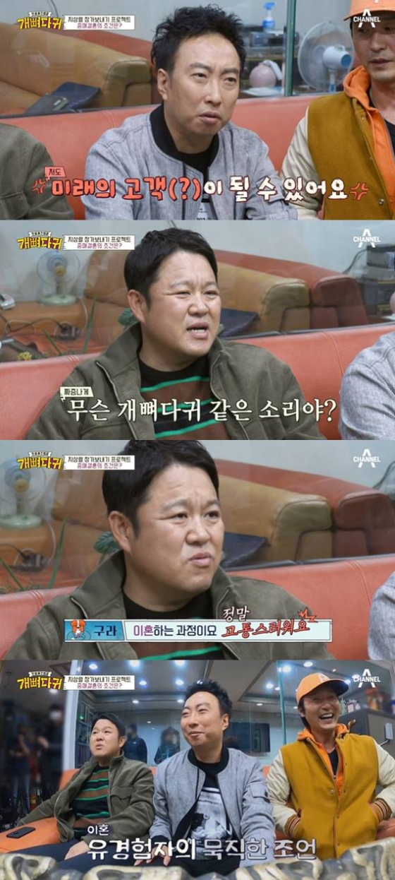 이에 발끈한 박명수는 "대놓고 그런 말을 하면 어떡하냐. 나도 미래의 고객이 될 수도 있다"고 말했다. 그러자 김구라는 "몰라서 그런데 이혼하는 과정이 정말 고통스럽고 쉽지 않다"고 털어놨다.