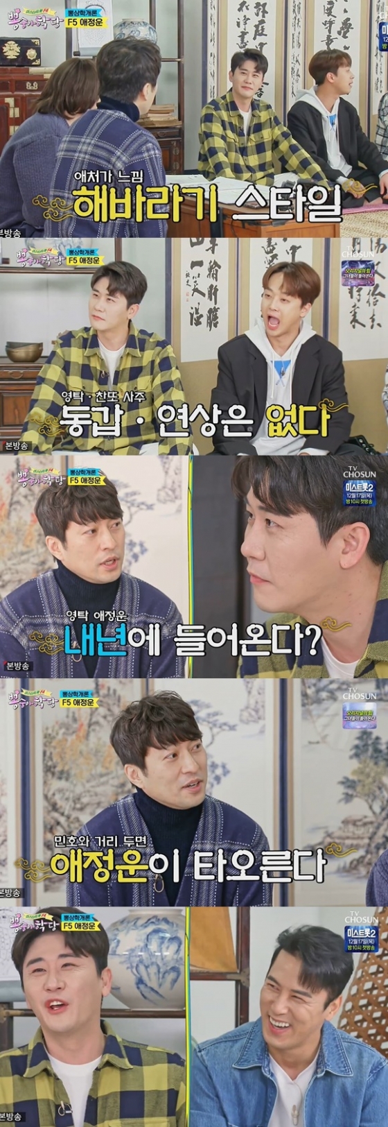 9일 오후 방송된 TV조선 예능프로그램 '뽕숭아학당'에서 F5(임영웅, 이찬원, 영탁, 장민호, 김희재)가 관상 평가를 받는 장면이 그려졌다.