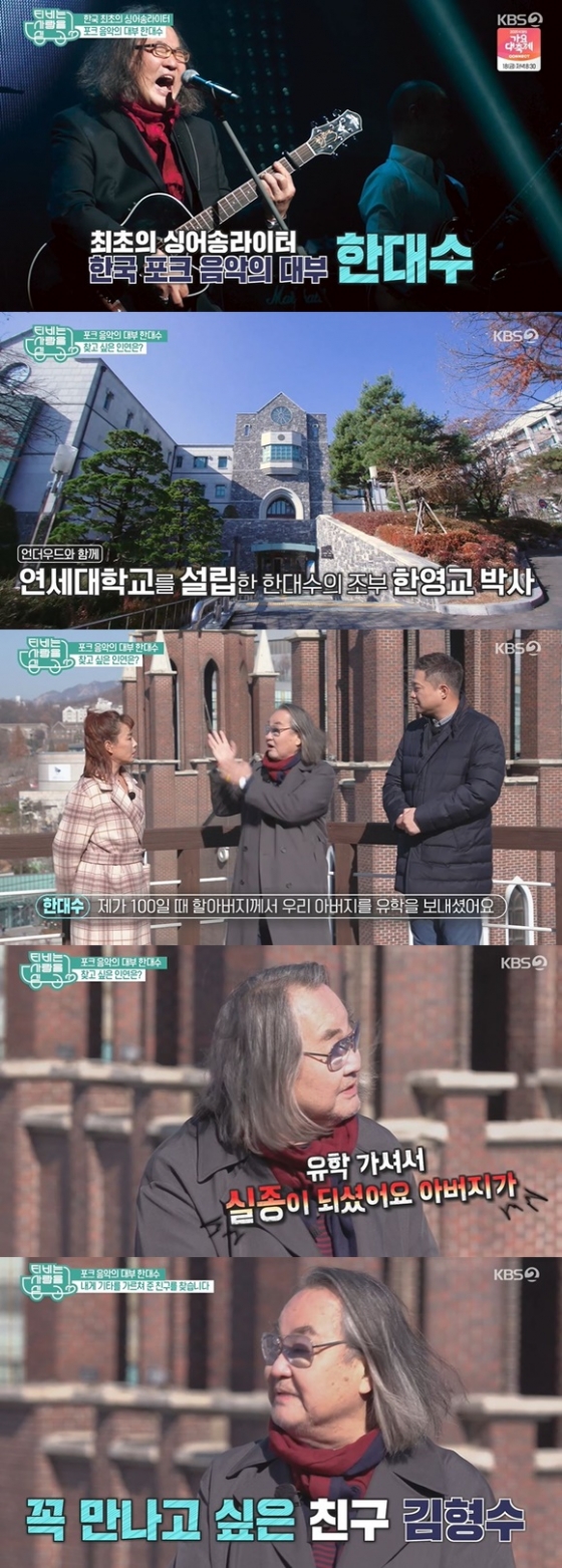 'TV는 사랑을 싣고'에서 한국 포크 음악의 대부 한대수가 연세대 창립자인 할아버지와 아버지에 대한 사연을 공개했다.
