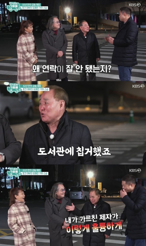 16일 오후 방송된 KBS 2TV 예능프로그램 'TV는 사랑을 싣고'에서 한대수가 고등학생 시절 자신에게 기타를 가르쳐준 친구와 재회했다.