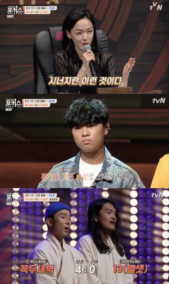 18일 오후 방송된 tvN '포커스'에는 '가요제'를 주제로 꼭두새벽(곡두, 송인효)과 열셋(류진, 세자전거)의 대결 무대가 담겼다.
