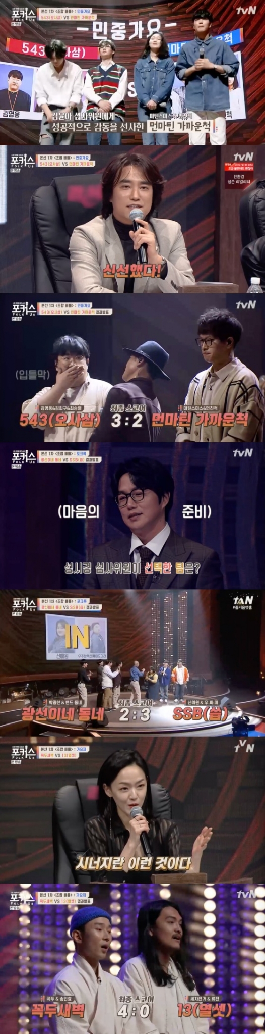 18일 오후 방송된 tvN '포커스'에는 '민중가요'를 주제로 오사삼(김영웅, 김희구, 최승열)과 먼마틴 가까운척(마틴스미스, 먼친척) 대결 무대가 담겼다.