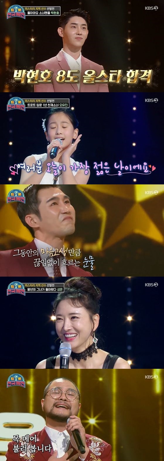12살 소녀 오유진이 색소폰과 함께 등장했다. 트로트 입문 1년차라고 밝힌 오유진은 김용임의 '오늘이 젊은 날'을 선곡했다. 첫 소절만으로 대기실의 주목을 받은 오유진은 코치들의 극찬을 받으며 8도 올스타를 받았다. '10대 마지막 합격자' 오유진은 경상도를 선택하며 다른 감독들의 아쉬움을 자아냈다.