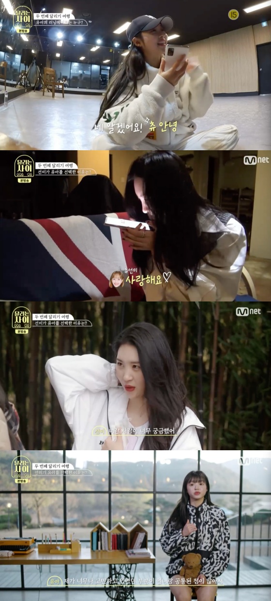 23일 오후 방송된 Mnet 예능프로그램 '달리는 사이'에는 선미와 유아가 한 유닛이 되어 달리는 장면이 담겼다.