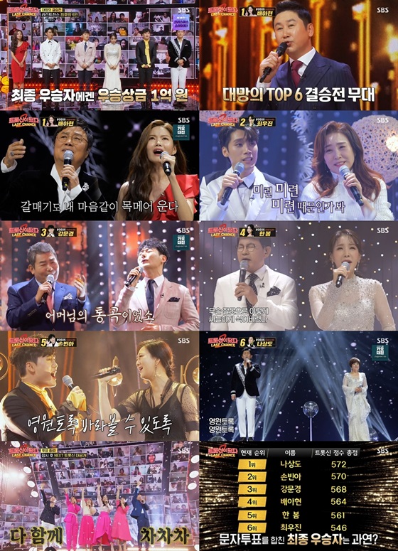 먼저 집계된 트롯신 점수에서는 '1등의 사나이' 나상도가 1위를 차지했다. 그러나 문자 투표로 모든 것이 뒤바뀔 수 있는 상황이었기에 참가자들 모두 떨리는 마음으로 결과를 기다렸다.