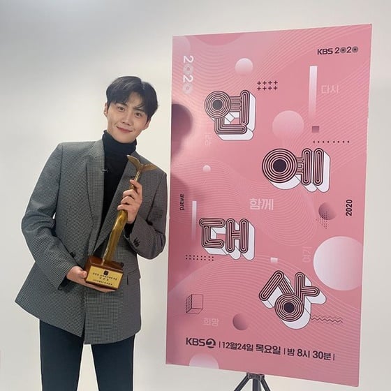 공개된 사진 속 김선호는 2020 KBS 연예대상 포스터 앞에서 신인상 트로피와 함께 미소를 짓고 있는 모습이다. 보는 것만으로도 훈훈함을 안기는 김선호의 모습이 시선을 끈다.