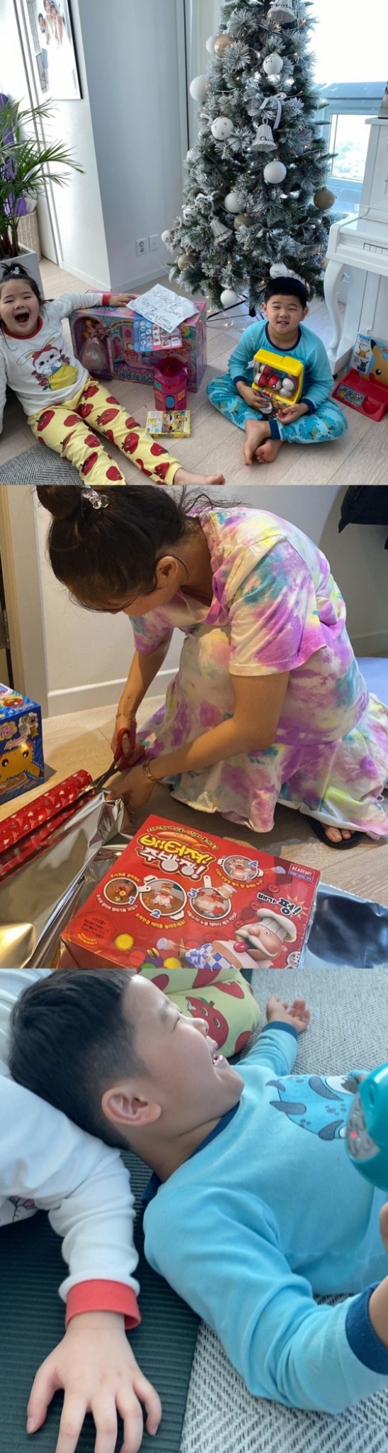 공개된 사진 속 장영란의 자녀들은 크리스마스 트리 아래 놓인 선물을 뜯고 행복한 표정을 짓고 있다.