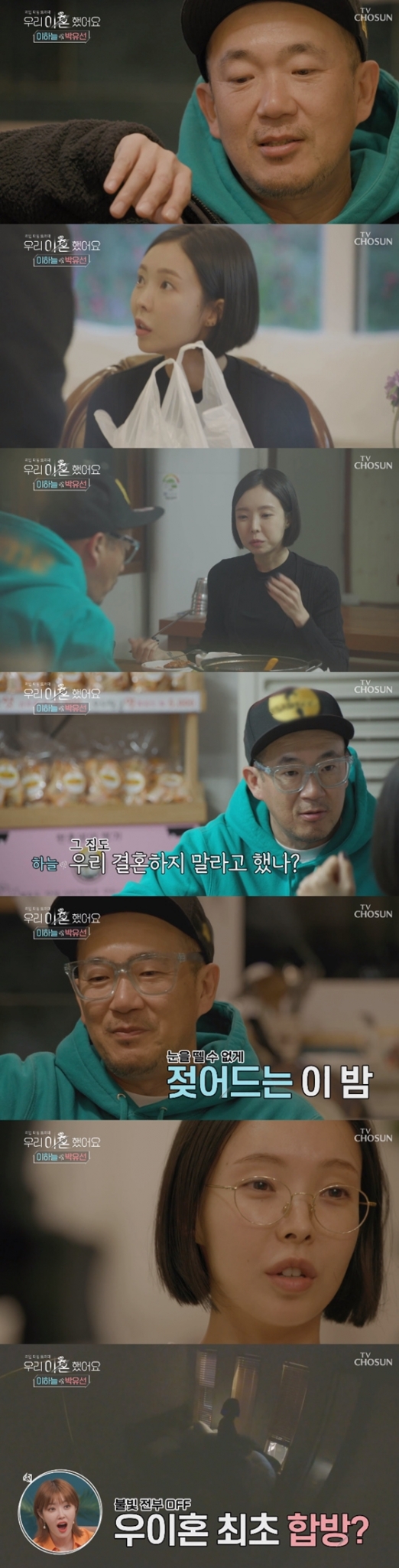 이하늘과 박유선은 티격태격 대화를 이어가면서 과거 추억을 하나씩 꺼내들었다. 한참 대화를 한 뒤 두 사람은 한 침대에 누웠다. '우이혼' 사상 첫 합방이었다. 두 사람은 아무렇지 않은 듯 서로에게 "잘 자"라는 말을 건넸다.