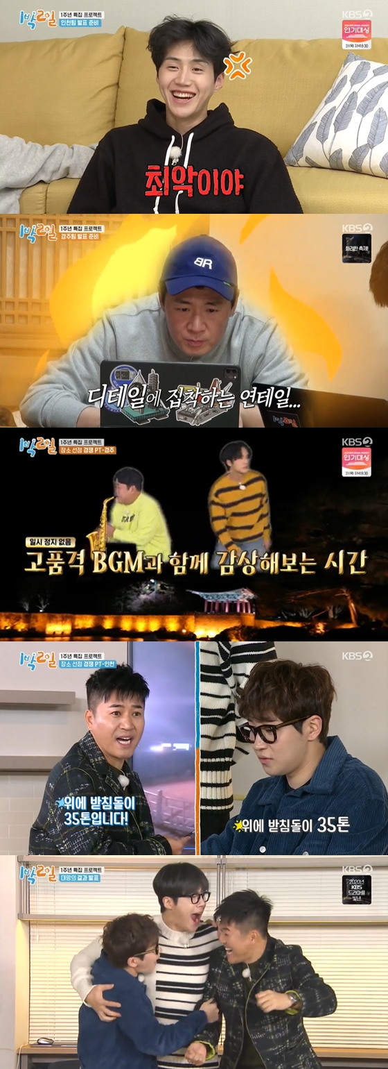 27일 오후 방송된 KBS 2TV 예능프로그램 '1박 2일' 시즌 4에서는 1주년 특집 프로젝트 '필 더 리듬 오브 더 코리아(Feel the Rhythm of the Korea)' 최종 장소 선정을 위한 경쟁 PT가 공개됐다.