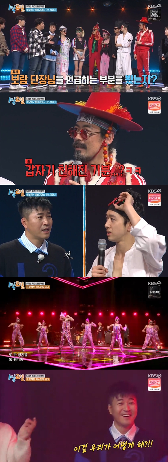 한편 '1박2일'은 이날치 밴드와 앰비규어스 댄스컴퍼니의 라이브 공연을 관람하게 됐다. 문세윤과 멤버들은 "김보람에 아는 척을 하라"며 김종민의 등을 떠밀었다. 단장 김보람은 방송을 관람한 뒤 "갑자기 친해진 기분이었다"며 웃음을 자아냈다. 두 사람은 20여 년 전 같은 댄스팀에서 활동했던 것으로 밝혀졌다.