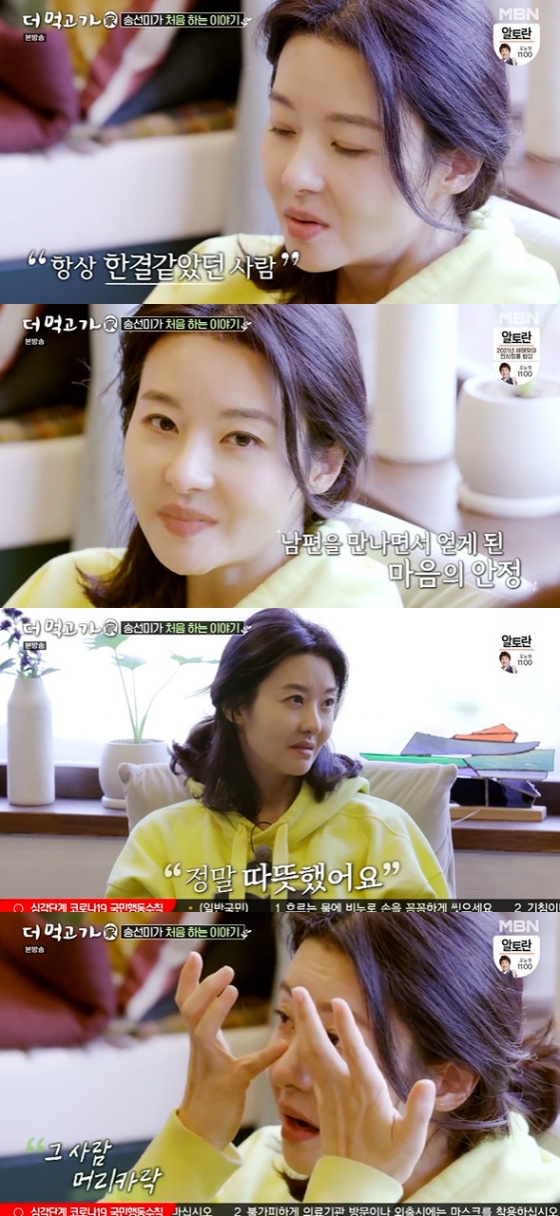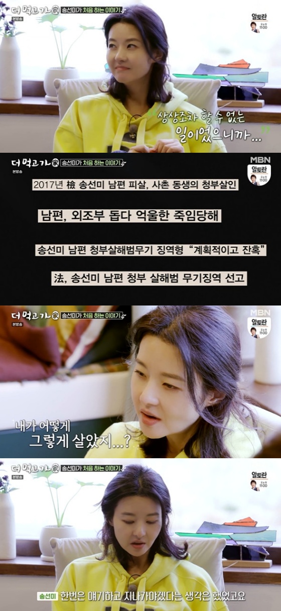 송선미는 27일 오후 방송된 MBN '더 먹고 가'에 게스트로 출연해 "너무 큰 일이다 보니까 많은 분들이 오히려 위로를 못 하시더라"라며 남편과 사별한 3년 전을 떠올렸다.
