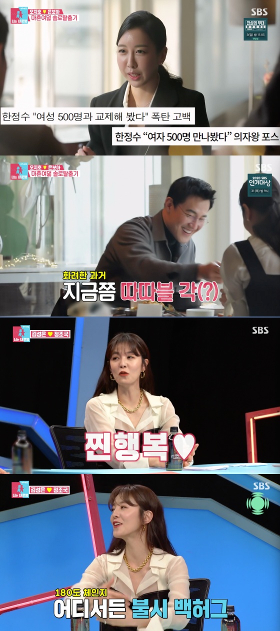한정수는 소개팅녀의 돌직구 질문에 당황했다. 한정수는 오지호-은보아 부부의 주선으로 소개팅을 하게 됐다. 소개팅녀는 한정수에게 "기사를 찾아봤는데 여자를 500명 만났다고 봤다"고 물었다.
